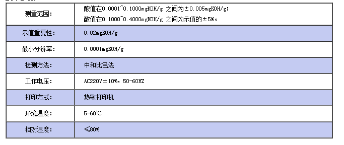 0.0001~0.100mgKOH/g之間為±0.0005mgKOH/g;酸值在0.100~0.40 |